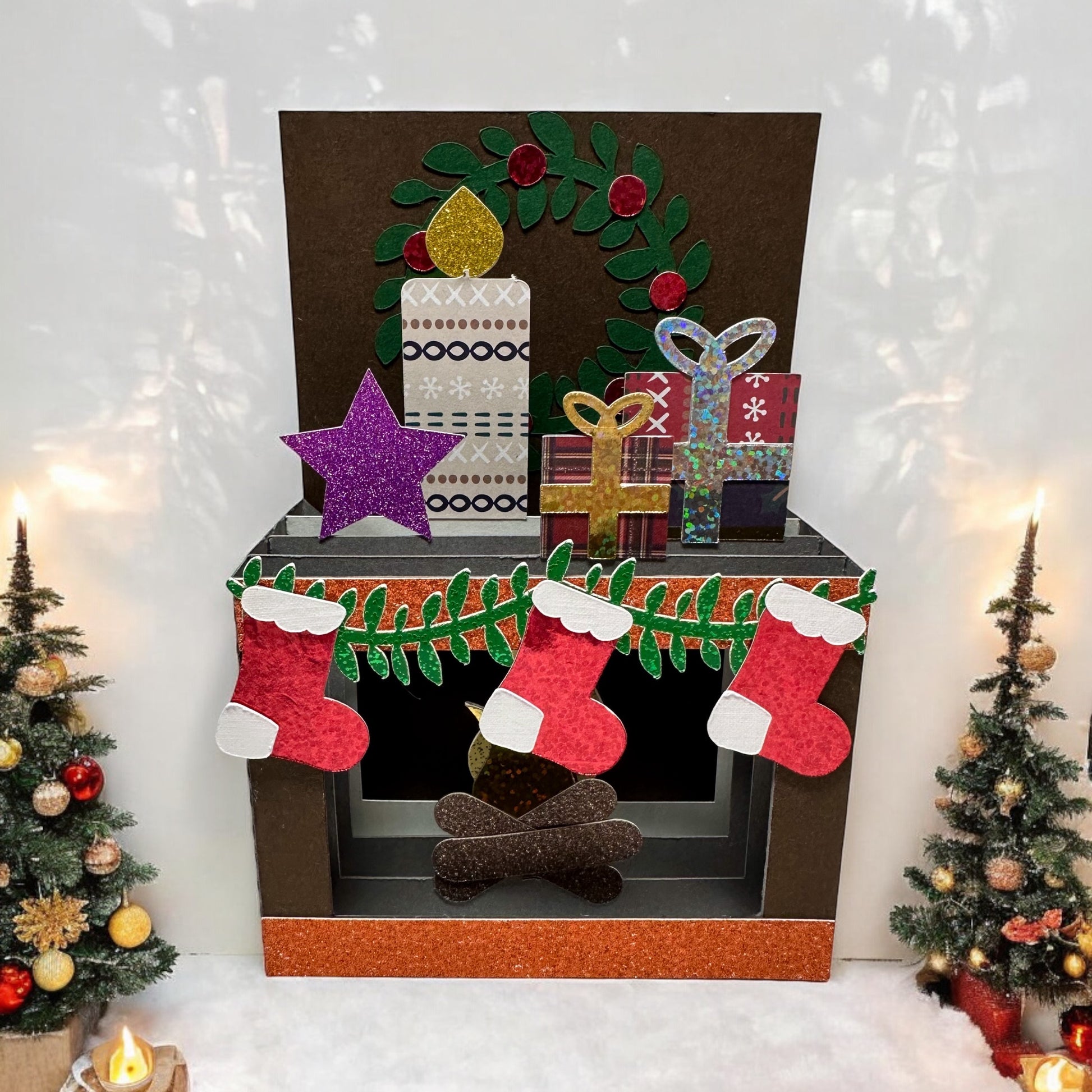 Experience a festive holiday wherever you are with this Christmas fireplace box card! Featuring a cozy fireplace, mantelpiece with stockings, and vibrant decorations, this unique card folds flat to fit in its custom envelope for easy gifting. Perfect for sending warm wishes and presents to loved ones.