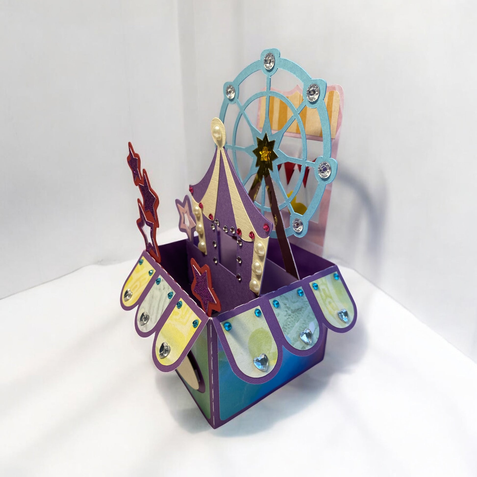 "Unleash the fun with our Circus Box Card! This 3D card folds flat and fits into its custom envelope. Perfect for all occasions, it features a Ferris wheel design that will give your loved ones a good time. Roll up and get it now!"