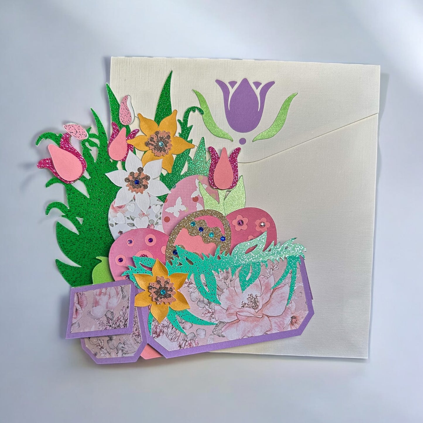 "Get ready to hop into spring with our Easter eggs basket! This 3d Easter card features a beautiful floral design and is perfect for celebrating the season. And when you're done, simply fold it flat and store it in its own envelope. Hop to it!"