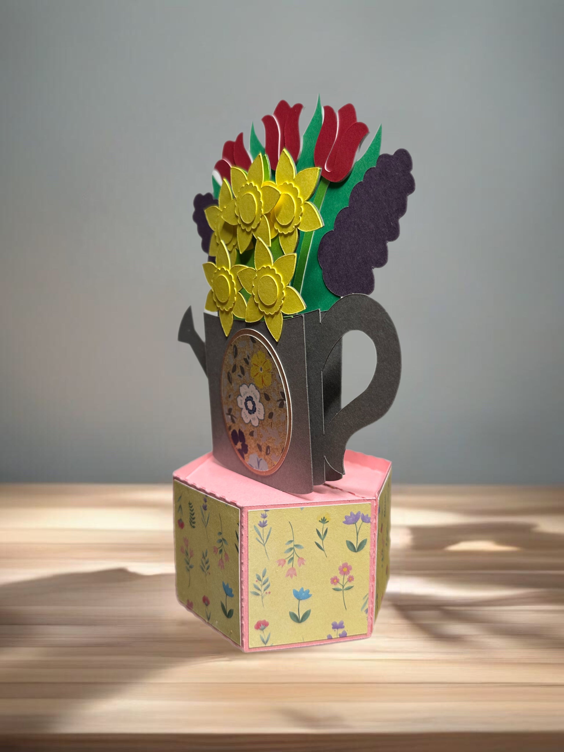 Say it with flowers! Our Flower Pail Pop Up Card is the perfect gift for any occasion. Featuring a bouquet of daffodils and lilies, this 3D card folds flat to fit in its custom envelope. Surprise your loved ones with a special message that pops!